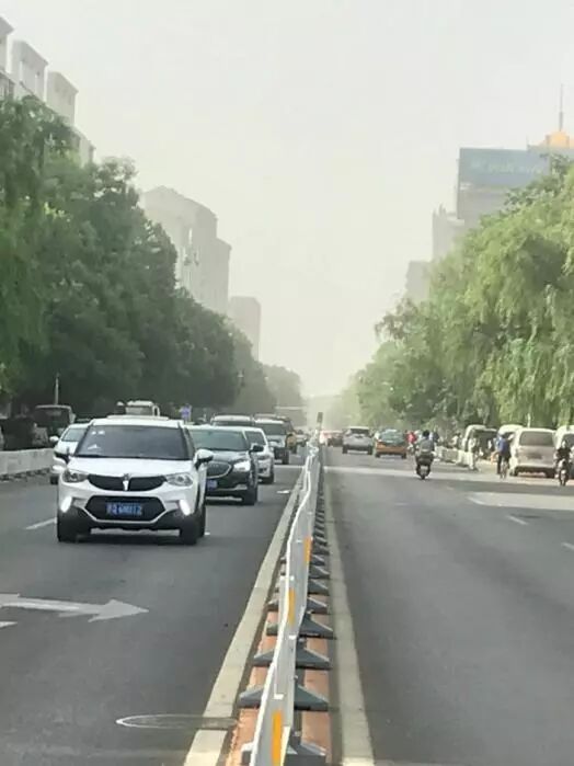 从图6可以看出,28日凌晨3点钟开始,北京地区空气污染指数达到爆表,这是由于内蒙古沙尘暴经过两天的行程于28日凌晨3:00到达北京,3:00以后飘尘使北京的空气质量急剧上升到AQI=712以上的严重污染。从图5看出当时空气湿度在30%以下,因此,北京地区没有发生雾霾。图7照片中看到北京市漫天黄尘(当时北京市所有汽车顶上都落下一层黄色尘土)而没有发生雾霾。见图7。
